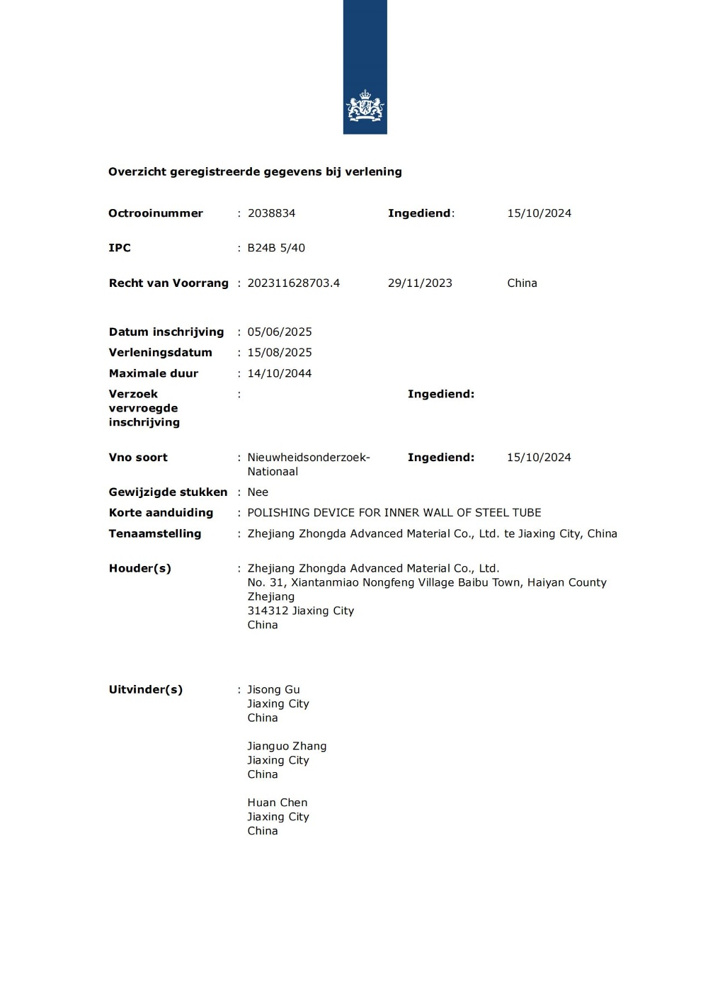 近日,中達新材自主研發的“鋼管內壁拋光裝置”成功獲得荷蘭專利局授權。